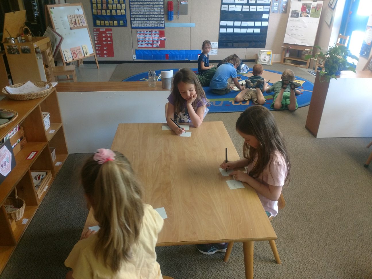 They cut out their words to attach to the back of a wood slice; their canvas for their end-of-the-year poetry portrait.